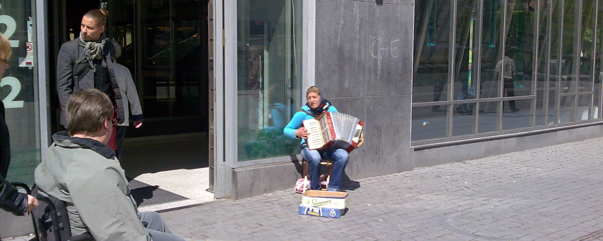 Έχει για παρέα τον τυφλό φίλο της που την συνοδεύει μουσικά με το αρμόνιο… ‘’σε τούτο το ντουνιά όλοι ίδιοι είμαστε’΄ Το πιστεύουν άραγε;;; Οι κακουχίες δεν τους έκαναν ν’ αποκτήσουν μίσος για όλα αυτά που στερήθηκαν;;; Το πρόσωπο του τυφλού άνδρα είναι τόσο αληθινά χαρούμενο που δεν σ αφήνει να αναρωτηθείς κάτι τέτοιο. Δίπλα τους 3 μικρές νάυλον τσάντες, πιθανότατα ότι υλική περιουσία έχουν σ’ αυτή την ζωή.