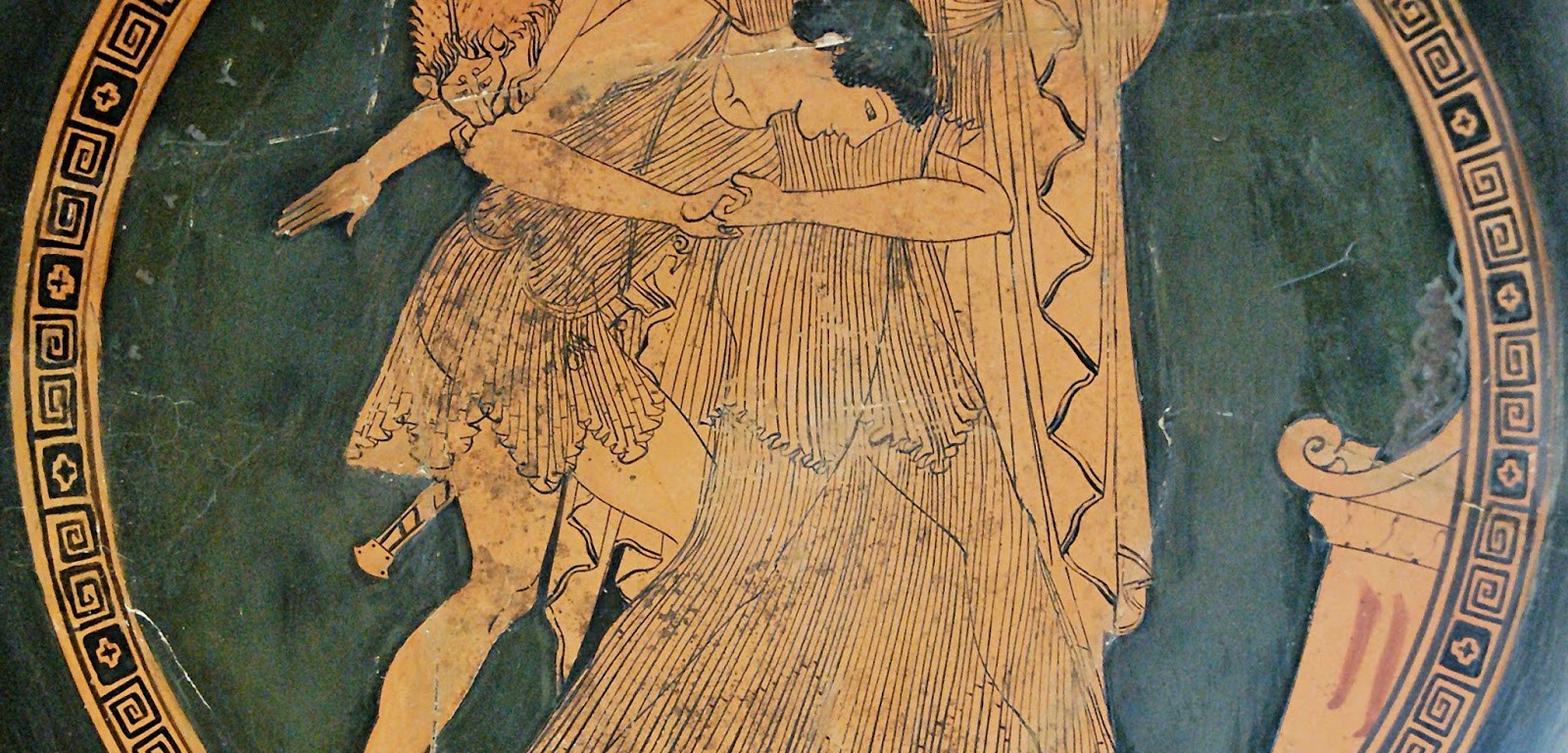 Το άνωθεν αγγείο δείχνει τον Πηλέα, να έχει δέσει τα χέρια του γύρω από τη Θέτιδα και να την κραταει σφιχτά, στιγμές πριν την αρπαγή της.